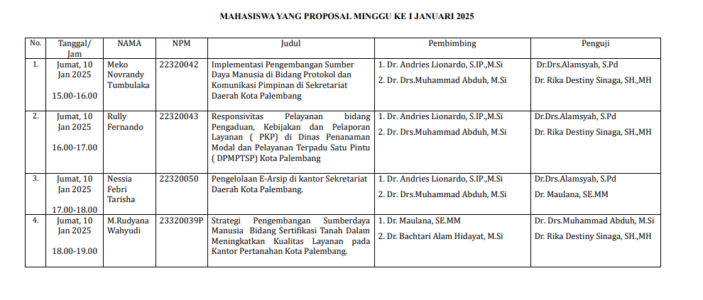 Pada tanggal 10 Januari 2025, Magister Ilmu Pemerintahan Universitas Tamansiswa Palembang telah memulai masa penyelenggaraan seminar proposal untuk mahasiswa yang sudah mendaftar sempro dan memenuhi persyaratan yang telah ditetapkan. Seperti biasa, Dalam penyelenggaraan seminar proposal, mahasiswa mempresentasikan seluruh rancangan penelitian mereka secara ringkas dan menarik kepada dosen penguji. Setelah itu, proposal tesis diuji dan diakhir seminar dosen penguji akan menentukan apakah proposal tesis mahasiswa tersebut layak untuk dilanjutkan ke tahap selanjutnya dan diujikan pada sidang ujian akhir tesis.