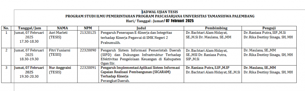 Pengumuman Hasil Kegiatan Sidang Tesis Tanggal 7 Febuari 2025 Pascasarjana Magister Ilmu Pemerintahan Universitas Tamansiswa Palembang