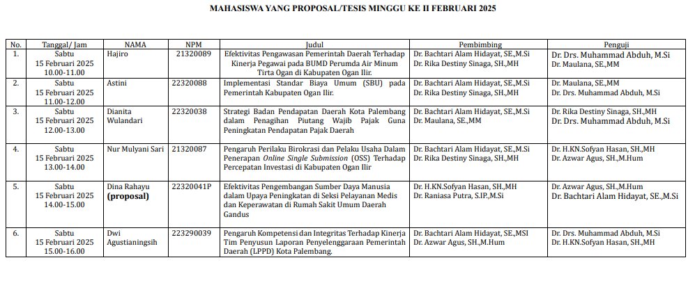 Pada tanggal 15 Febuari 2025, Magister Ilmu Pemerintahan Universitas Tamansiswa Palembang telah memulai masa penyelenggaraan sidang tesis untuk mahasiswa yang sudah lulus dari sempro dan memenuhi persyaratan yang telah ditetapkan. Seperti sebelumnya, Dalam penyelenggaraannya, mahasiswa mempresentasikan hasil penelitian mereka kepada penguji dan penguji akan menentukan apakah hasil tesis mereka tersebut layak untuk disajikan sebagai persyaratan lulus pendidikan magister ilmu pemerintahan. Selain itu juga, ada satu mahasiswa pada hari ini yang mengikuti seminar proposal.