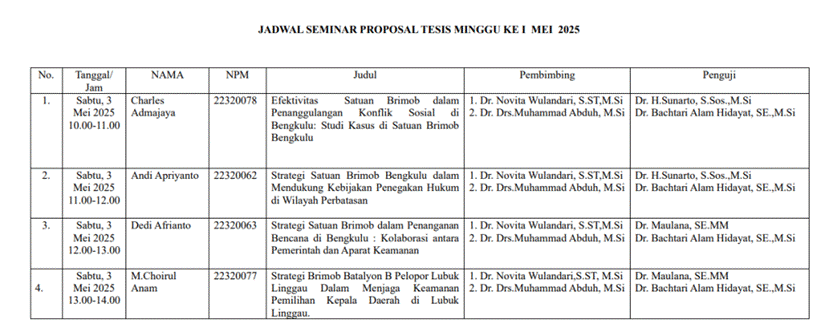 Pada tanggal 3 Mei 2025, Magister Ilmu Pemerintahan Universitas Tamansiswa Palembang telah memulai masa penyelenggaraan seminar proposal untuk mahasiswa yang sudah mendaftar sempro dan memenuhi persyaratan yang telah ditetapkan. Seperti biasa, Dalam penyelenggaraan seminar proposal, mahasiswa mempresentasikan seluruh rancangan penelitian mereka secara ringkas dan menarik kepada dosen penguji. Setelah itu, proposal tesis diuji dan diakhir seminar dosen penguji akan menentukan apakah proposal tesis mahasiswa tersebut layak untuk dilanjutkan ke tahap selanjutnya dan diujikan pada sidang ujian akhir tesis.