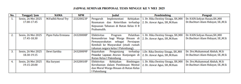 Pada tanggal 27 Mei 2025, Magister Ilmu Pemerintahan Universitas Tamansiswa Palembang telah memulai masa penyelenggaraan seminar proposal untuk mahasiswa yang sudah mendaftar sempro dan memenuhi persyaratan yang telah ditetapkan. Seperti biasa, Dalam penyelenggaraan seminar proposal, mahasiswa mempresentasikan seluruh rancangan penelitian mereka secara ringkas dan menarik kepada dosen penguji. Setelah itu, proposal tesis diuji dan diakhir seminar dosen penguji akan menentukan apakah proposal tesis mahasiswa tersebut layak untuk dilanjutkan ke tahap selanjutnya dan diujikan pada sidang ujian akhir tesis.