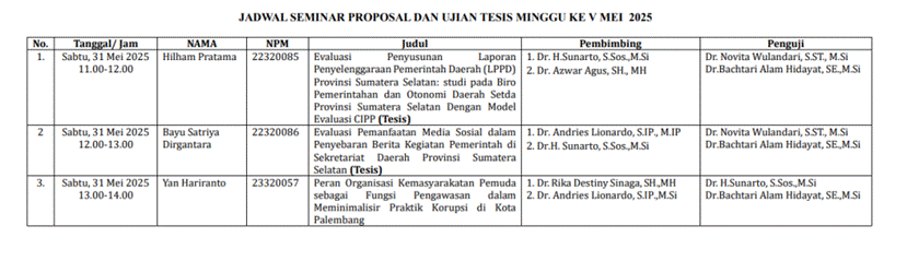 Pengumuman Hasil Kegiatan Sidang Tesis dan Seminar Proposal Tanggal 31 Mei 2025 Pascasarjana Magister Ilmu Pemerintahan Universitas Tamansiswa Palembang