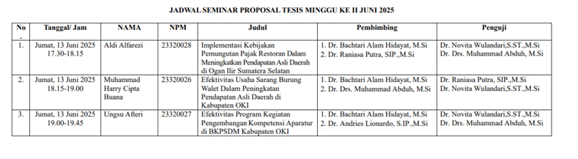 Pada tanggal 13 Juni 2025, Magister Ilmu Pemerintahan Universitas Tamansiswa Palembang telah memulai masa penyelenggaraan seminar proposal untuk mahasiswa yang sudah mendaftar sempro dan memenuhi persyaratan yang telah ditetapkan. Seperti biasa, Dalam penyelenggaraan seminar proposal, mahasiswa mempresentasikan seluruh rancangan penelitian mereka secara ringkas dan menarik kepada dosen penguji. Setelah itu, proposal tesis diuji dan diakhir seminar dosen penguji akan menentukan apakah proposal tesis mahasiswa tersebut layak untuk dilanjutkan ke tahap selanjutnya dan diujikan pada sidang ujian akhir tesis.