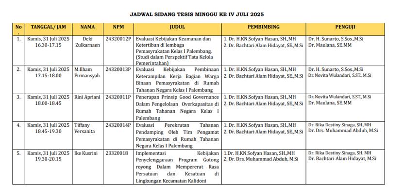 Pengumuman Hasil Kegiatan Sidang Tesis Tanggal 31 Juli 2025 Pascasarjana Magister Ilmu Pemerintahan Universitas Tamansiswa Palembang