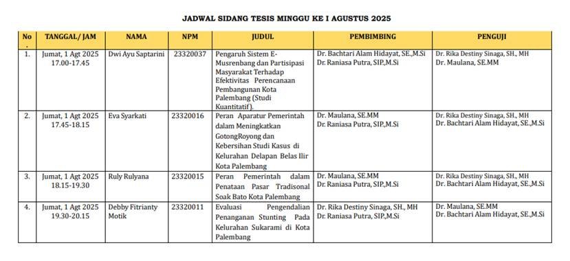 Pada tanggal 1 Agustus 2025, Magister Ilmu Pemerintahan Universitas Tamansiswa Palembang telah memulai masa penyelenggaraan sidang tesis untuk mahasiswa yang sudah lulus dari sempro dan memenuhi persyaratan yang telah ditetapkan. Seperti sebelumnya, Dalam penyelenggaraannya, mahasiswa mempresentasikan hasil penelitian mereka kepada penguji dan penguji akan menentukan apakah hasil tesis mereka tersebut layak untuk disajikan sebagai persyaratan lulus pendidikan magister ilmu pemerintahan.