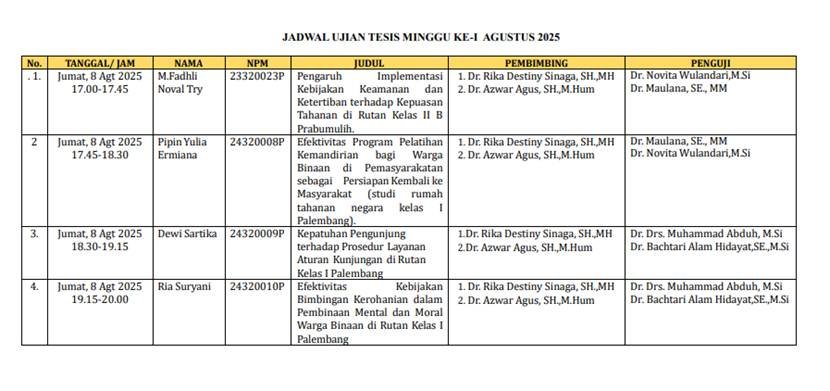 Pada tanggal 8 Agustus 2025, Magister Ilmu Pemerintahan Universitas Tamansiswa Palembang telah memulai masa penyelenggaraan sidang tesis untuk mahasiswa yang sudah lulus dari sempro dan memenuhi persyaratan yang telah ditetapkan. Seperti sebelumnya, Dalam penyelenggaraannya, mahasiswa mempresentasikan hasil penelitian mereka kepada penguji dan penguji akan menentukan apakah hasil tesis mereka tersebut layak untuk disajikan sebagai persyaratan lulus pendidikan magister ilmu pemerintahan.