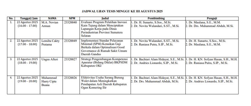 Pada tanggal 22 Agustus 2025, Magister Ilmu Pemerintahan Universitas Tamansiswa Palembang sudah memulai masa penyelenggaraan sidang tesis untuk mahasiswa yang sudah lulus dari sempro dan memenuhi persyaratan yang telah ditetapkan. Seperti sebelumnya, Dalam penyelenggaraannya, mahasiswa mempresentasikan hasil penelitian mereka kepada penguji dan penguji akan menentukan apakah hasil tesis mereka tersebut layak untuk disajikan sebagai persyaratan lulus pendidikan magister ilmu pemerintahan.