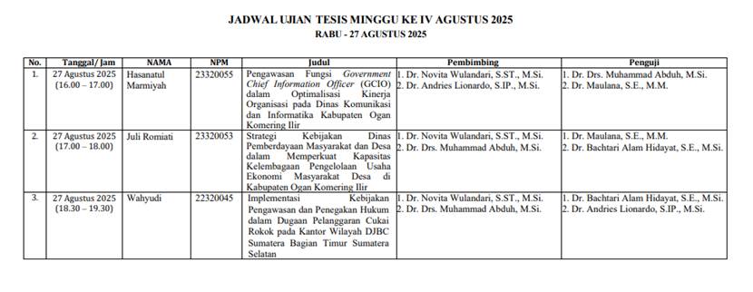 Pengumuman Hasil Kegiatan Sidang Tesis Tanggal 27 Agustus 2025 Pascasarjana Magister Ilmu Pemerintahan Universitas Tamansiswa Palembang