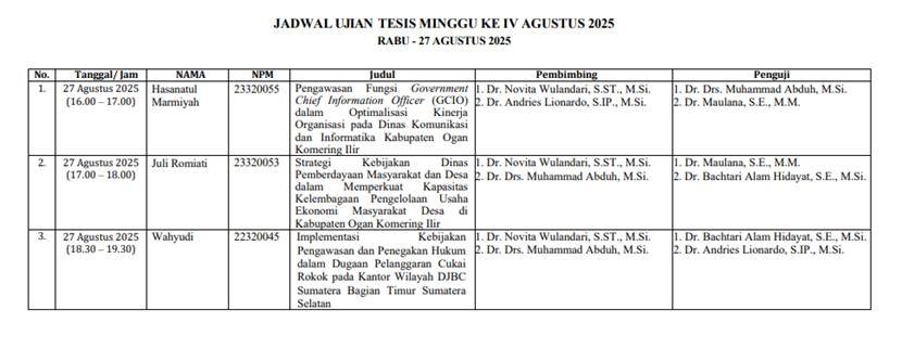Pada tanggal 27 Agustus 2025, Magister Ilmu Pemerintahan Universitas Tamansiswa Palembang telah memulai masa penyelenggaraan sidang tesis untuk mahasiswa yang sudah lulus dari sempro dan memenuhi persyaratan yang telah ditetapkan. Seperti sebelumnya, Dalam penyelenggaraannya, mahasiswa mempresentasikan hasil penelitian mereka kepada penguji dan penguji akan menentukan apakah hasil tesis mereka tersebut layak untuk disajikan sebagai persyaratan lulus pendidikan magister ilmu pemerintahan.