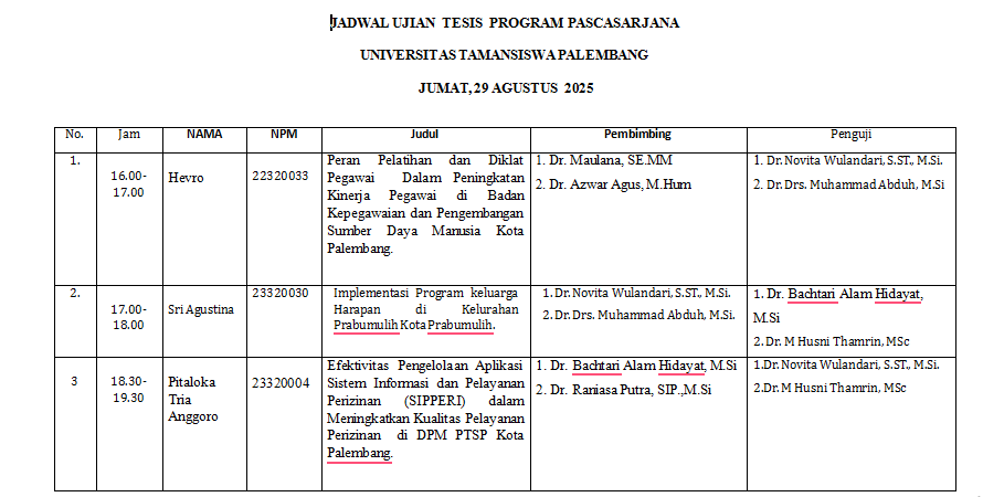 Pada tanggal 29 Agustus 2025, Magister Ilmu Pemerintahan Universitas Tamansiswa Palembang memulai masa penyelenggaraan sidang tesis untuk mahasiswa yang sudah lulus dari sempro dan memenuhi persyaratan yang telah ditetapkan. Seperti sebelumnya, Dalam penyelenggaraannya, mahasiswa mempresentasikan hasil penelitian mereka kepada penguji dan penguji akan menentukan apakah hasil tesis mereka tersebut layak untuk disajikan sebagai persyaratan lulus pendidikan magister ilmu pemerintahan.