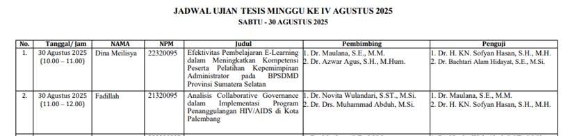 Pada tanggal 30 Agustus 2025, Magister Ilmu Pemerintahan Universitas Tamansiswa Palembang telah memulai masa penyelenggaraan sidang tesis untuk mahasiswa yang sudah lulus dari sempro dan memenuhi persyaratan yang telah ditetapkan. Seperti sebelumnya, Dalam penyelenggaraannya, mahasiswa mempresentasikan hasil penelitian mereka kepada penguji dan penguji akan menentukan apakah hasil tesis mereka tersebut layak untuk disajikan sebagai persyaratan lulus pendidikan magister ilmu pemerintahan.