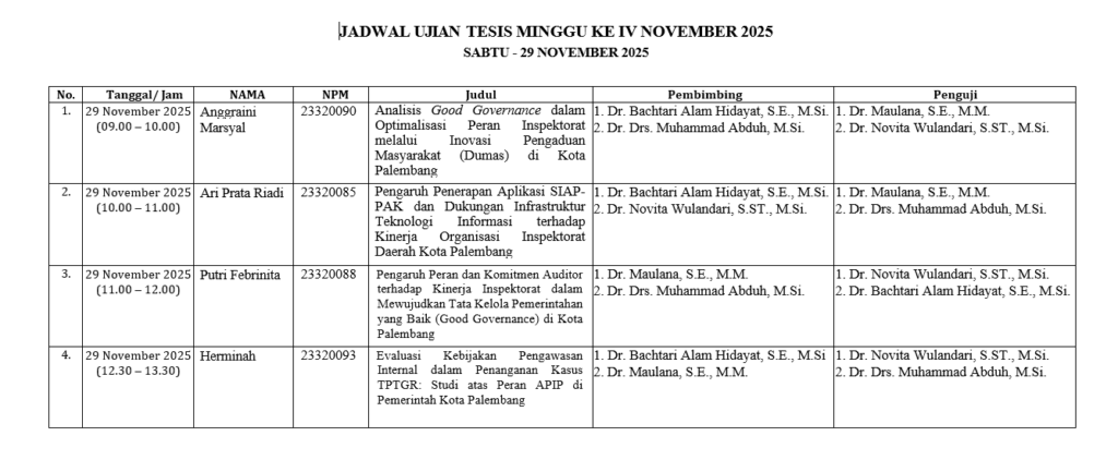 Pada tanggal 29 November 2025, Magister Ilmu Pemerintahan Universitas Tamansiswa Palembang telah memulai masa penyelenggaraan seminar proposal untuk mahasiswa yang sudah mendaftar sempro dan memenuhi persyaratan yang telah ditetapkan. Seperti biasa, Dalam penyelenggaraan seminar proposal, mahasiswa mempresentasikan seluruh rancangan penelitian mereka secara ringkas dan menarik kepada dosen penguji. Setelah itu, proposal tesis diuji dan diakhir seminar dosen penguji akan menentukan apakah proposal tesis mahasiswa tersebut layak untuk dilanjutkan ke tahap selanjutnya dan diujikan pada sidang ujian akhir tesis.