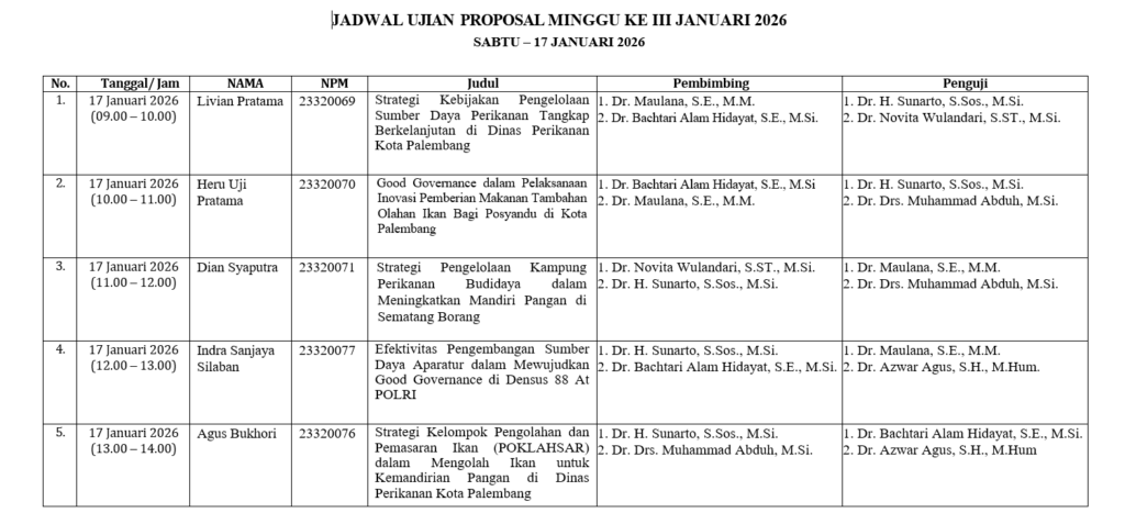 Pada tanggal 17 Januari 2026, Magister Ilmu Pemerintahan Universitas Tamansiswa Palembang telah memulai masa penyelenggaraan seminar proposal untuk mahasiswa yang sudah mendaftar sempro dan memenuhi persyaratan yang telah ditetapkan. Seperti biasa, Dalam penyelenggaraan seminar proposal, mahasiswa mempresentasikan seluruh rancangan penelitian mereka secara ringkas dan menarik kepada dosen penguji. Setelah itu, proposal tesis diuji dan diakhir seminar dosen penguji akan menentukan apakah proposal tesis mahasiswa tersebut layak untuk dilanjutkan ke tahap selanjutnya dan diujikan pada sidang ujian akhir tesis.