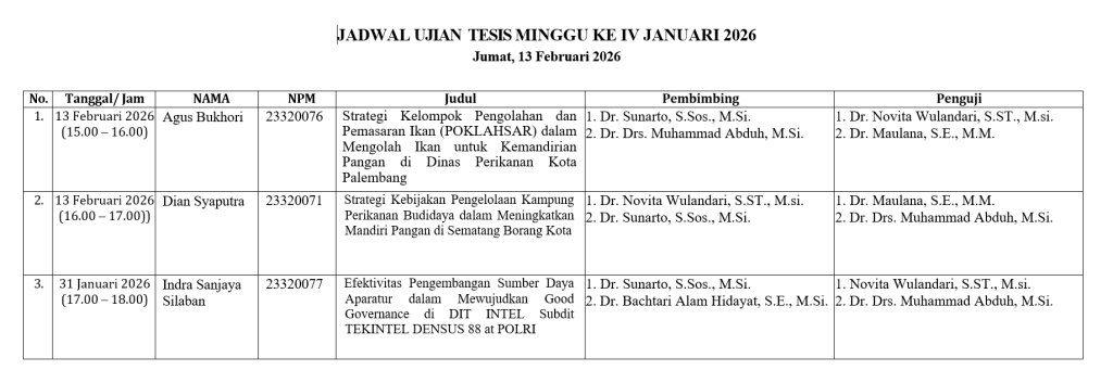 Pada tanggal 13 Febuari 2026, Magister Ilmu Pemerintahan Universitas Tamansiswa Palembang memulai masa penyelenggaraan sidang tesis untuk mahasiswa yang sudah lulus dari sempro dan memenuhi persyaratan yang telah ditetapkan. Seperti sebelumnya, Dalam penyelenggaraannya, mahasiswa mempresentasikan hasil penelitian mereka kepada penguji dan penguji akan menentukan apakah hasil tesis mereka tersebut layak untuk disajikan sebagai persyaratan lulus pendidikan magister ilmu pemerintahan.
